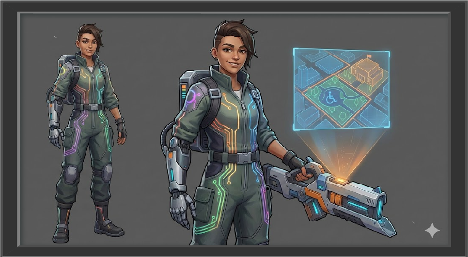 2. Erişilebilirlik Mühendisi (Eylem) “Genç dostu kent” idealini inşa eden siber-punk bir saha ajanı. Elindeki “Çözüm Projektörü” ile fiziksel ve bürokratik engelleri tarar, saniyeler içinde erişilebilir rampalar ve yollar tasarlar. Mazeret değil, çözüm üretir.